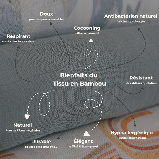 Le coton est une belle matière, mais le bambou a un petit plus magique ✨ : il est encore plus respirant, plus absorbant et surtout plus doux. Résultat : bébé reste au frais en été, bien au chaud en hiver, et toujours super confortable.